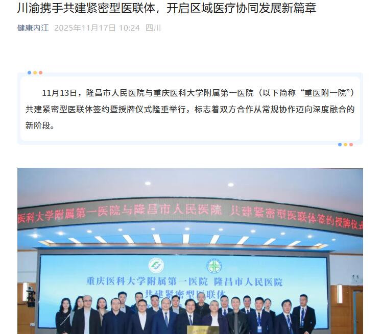 11月13日,隆昌市人民医院与重庆医科大学附属第一医院(以下简称“重医附一院”)共建紧密型医联体签约暨授牌仪式隆重举行,标志着双方合作从常规协作迈向深..