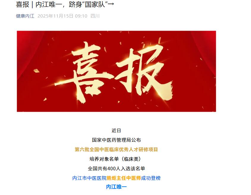 2025年11月15日 09:10 四川近日国家中医药管理局公布第六批全国中医临床优秀人才研修项目培养对象名单(临床类)全国共有400人入选该名单内江..