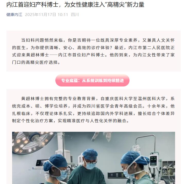当妇科问题悄然来临,你是否期待一位既具深厚专业素养,又兼具人文关怀的医生,为你提供清晰、安心、高效的诊疗体验?最近,内江市第二人民医院正式迎来黄超林博..