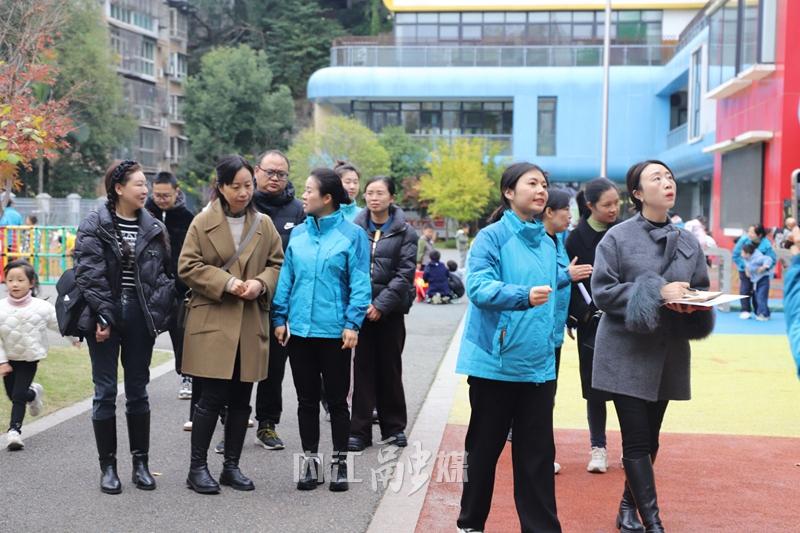 调研小组先后察看了幼儿园户外活动场地、活动室等区域,了解设施设备配置、安全管理落实情况和托幼一体园维港园的建设情况。内江二幼相关人员围绕托幼一体化发展路径作专题汇报,并从品牌打造、师资建设、医育融合三大维度,阐述了园所响应国家优化生育政策、破解“托育难”民生诉求的实践与思考。