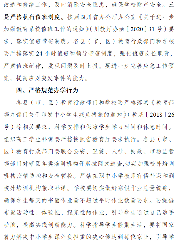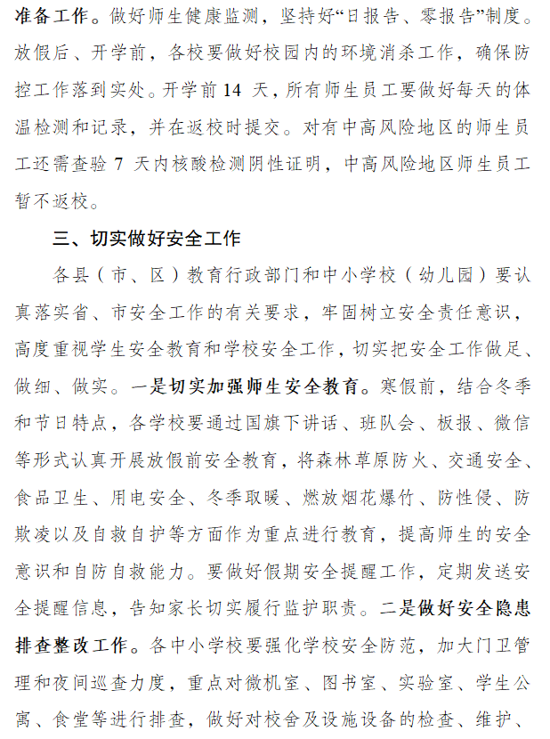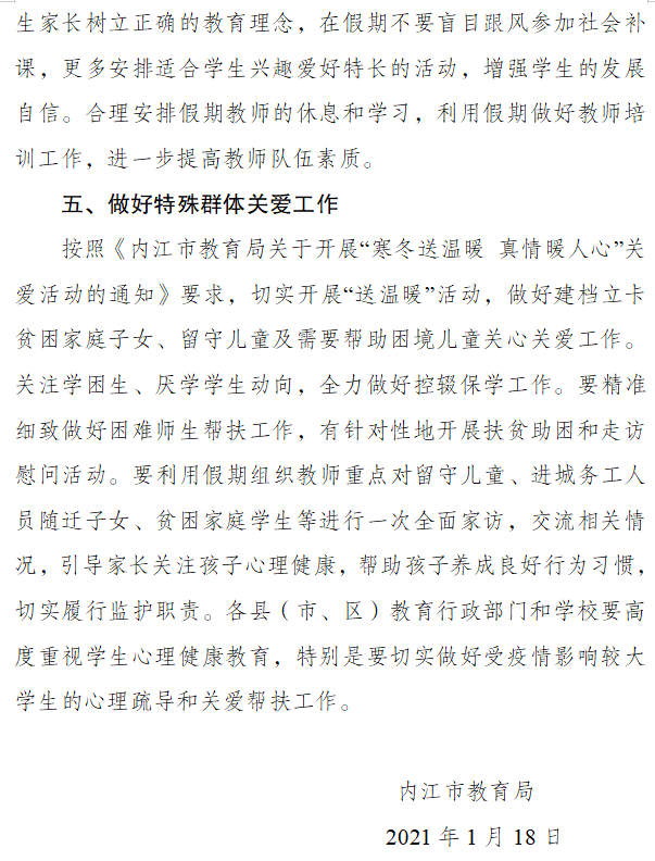 2021年寒假将至,为切实做好常态化疫情防控背景下中小学、幼儿园假期各项工作,1月18日,内江市教育局印发了《关于做好2021年中小学幼儿园寒假工作的通知》,明确了放假时间安排、做好疫情防控工作等相关内容。