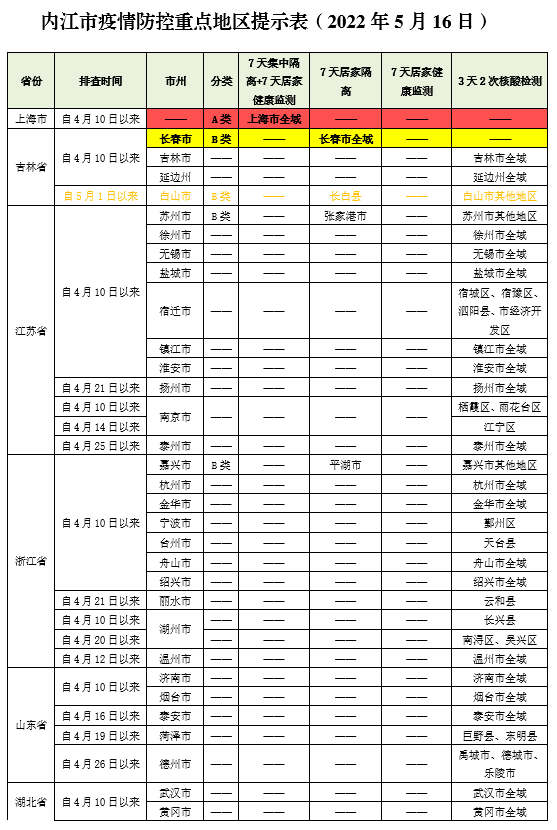 内江市疫情防控重点地区提示表(2022年5月16日)
