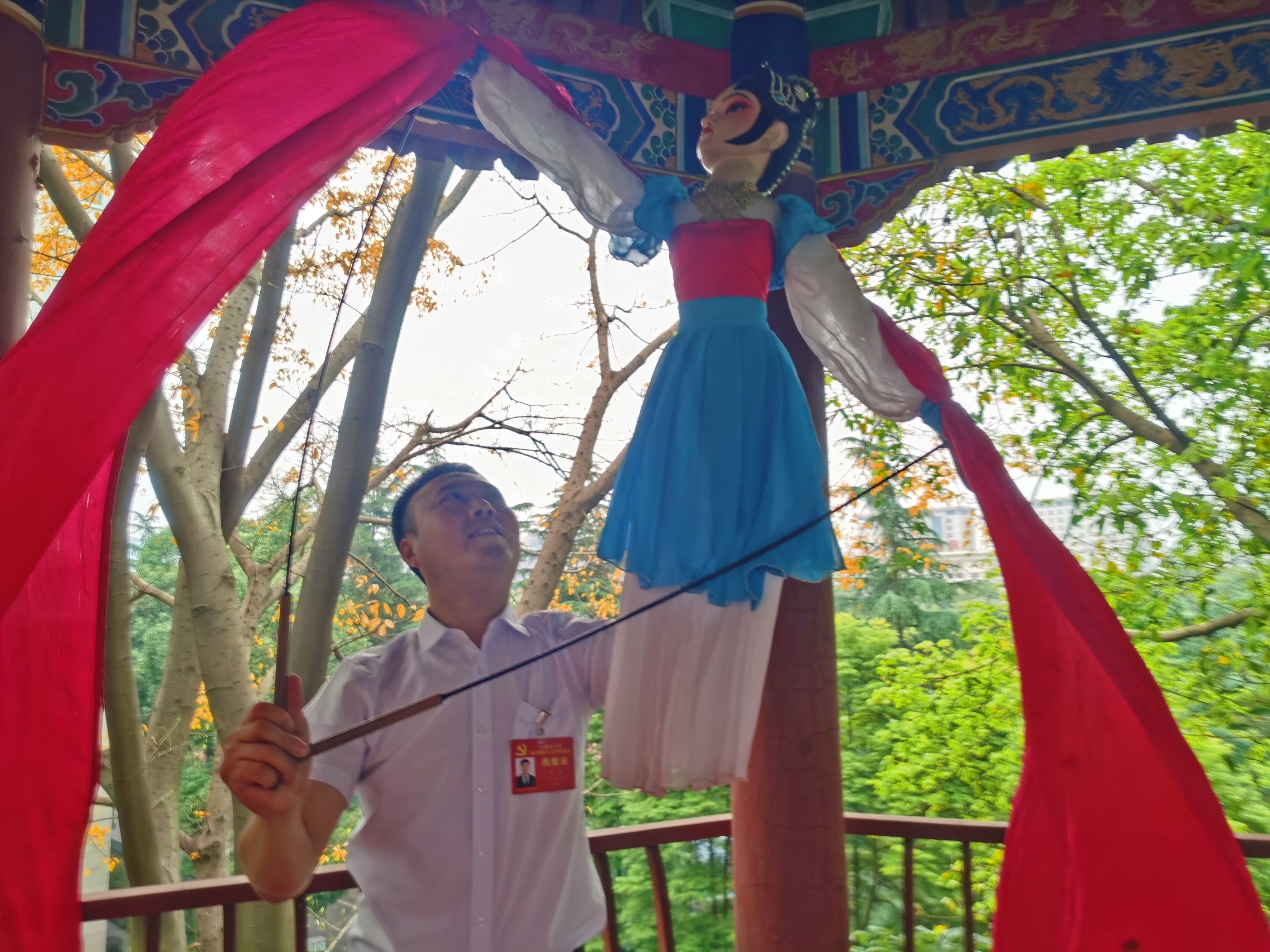 原来,这个长绸木偶,是省第十二次党代会代表林昆特意从家乡带来的。林昆,四川省第七批省级非遗代表性传承人,现任内江市资中县孟塘镇睦邻村第一书记、资中县非遗保护中心工作人员。研究木偶戏艺术近15年,林昆独立创编的《长袖舞》等多个剧目,数次荣获全国木偶皮影技艺大赛奖项。目前,资中中型杖头木偶戏已成功申报为国家级非遗,实现内江市国家级非遗“零”突破。