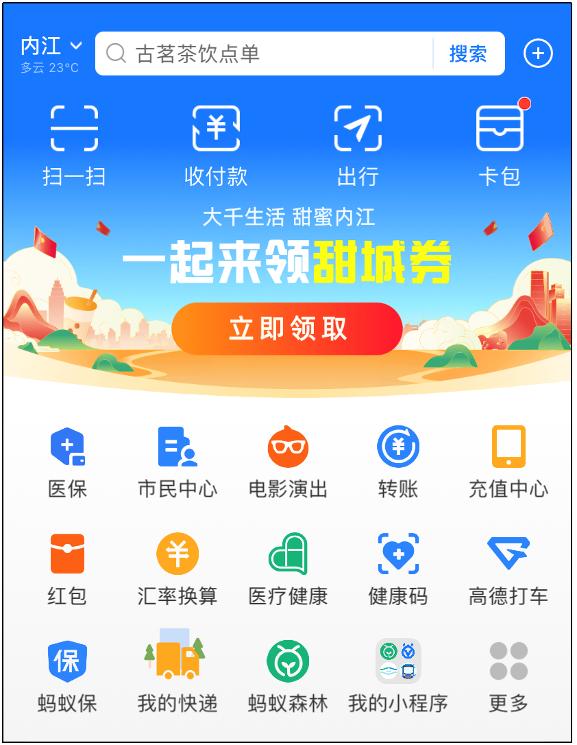 内江市辖区范围内的支付宝用户(已绑定手机号码且完成支付宝实名认证)可通过支付宝在首页点击“一起来领甜城券”或搜索“内江甜城券”进入活动主会场领取。也可通过支付宝扫描“甜城券”专属二维码进入会场(活动期间有效)领取。