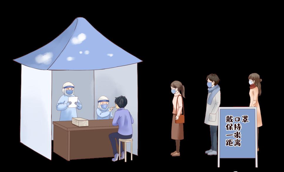 ✔正确:前面的受测者结束后,等待医生完成双手消毒,拿出新棉签后,迅速上前脱下口罩张嘴采样,取样结束后立刻带好口罩。