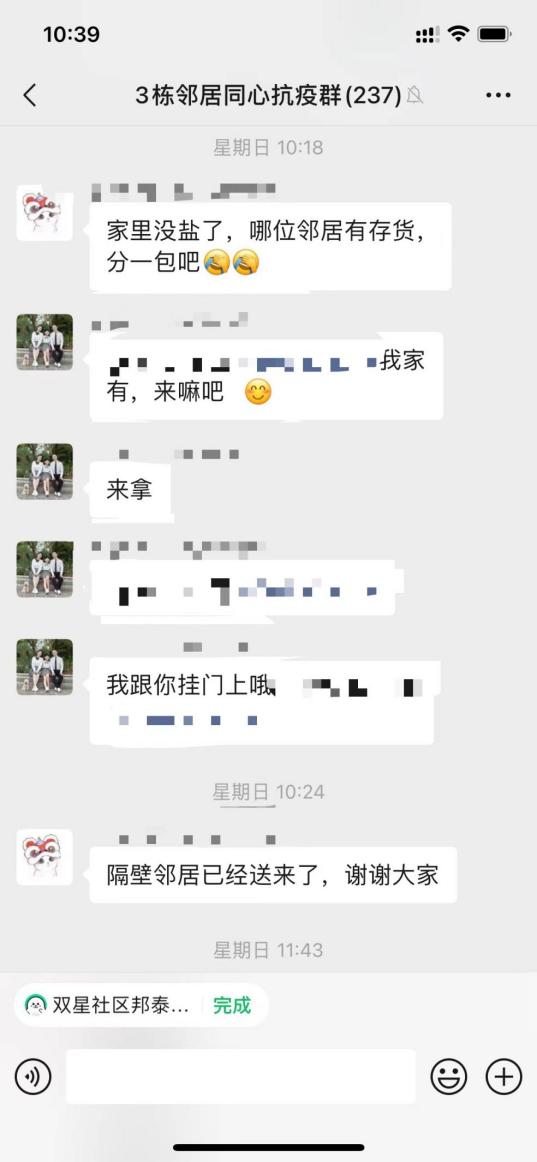 在东兴区西林街道双星社区邦泰铂仕公馆的业主群里,每天都上演着这些温馨的对话。一场疫情,让大家重新定义了邻里关系。