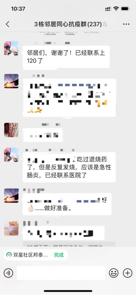 9月17日晚,有人突然在群里求助,孩子发烧需要送医,小区居民看到群消息后纷纷为她出主意先给孩子降温,3栋的楼长立即联系医院,和社区物业一起将发烧的孩子送上了救护车。