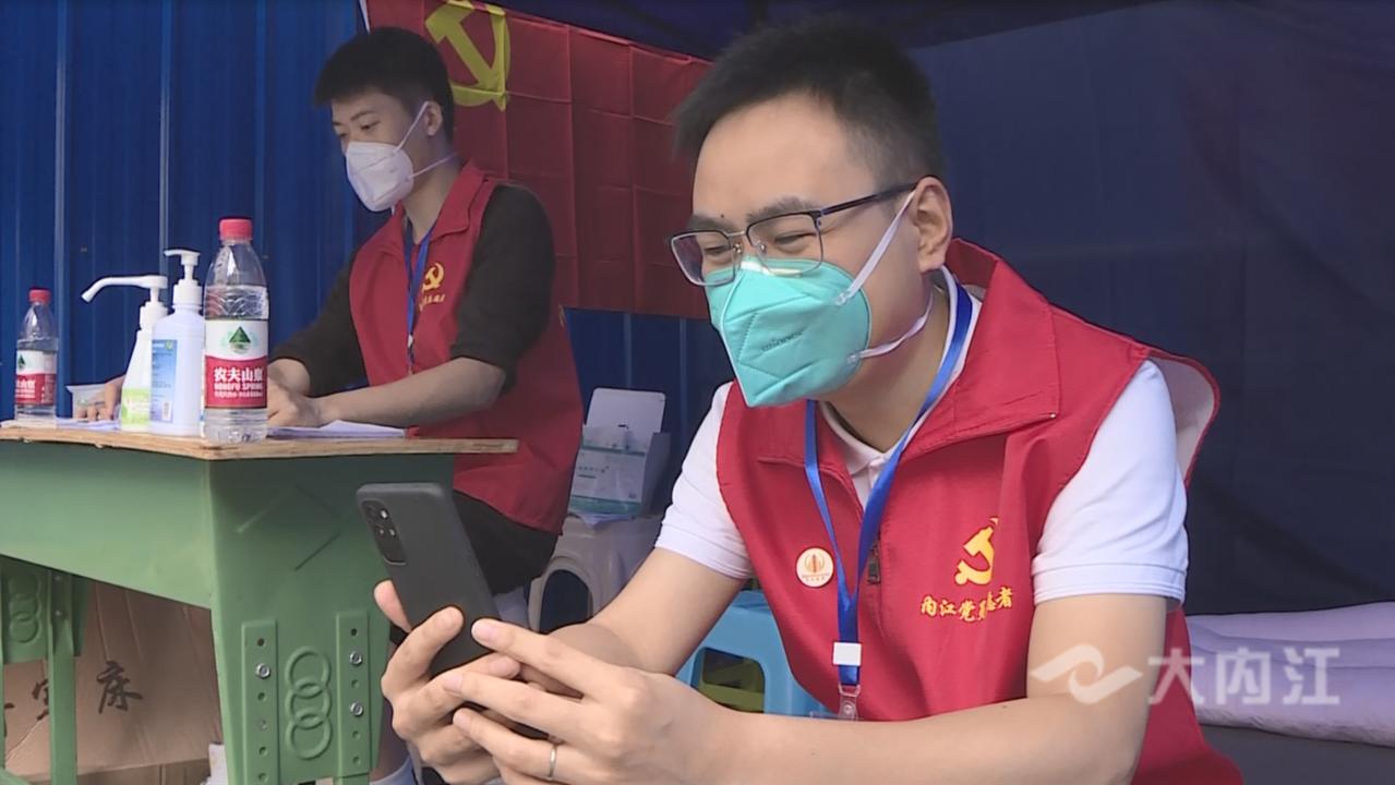 在市中区城东街道文英街卡口,值守了一天的内江路桥集团疫情防控志愿者曾治,终于得空与家人进行视频通话。虽然十分疲惫,但此时曾治的脸上始终洋溢着幸福的笑容。今年4月,他刚刚晋升为父亲,本轮疫情发生以来,他主动请缨,安顿好家人后,迅速投身抗疫一线。