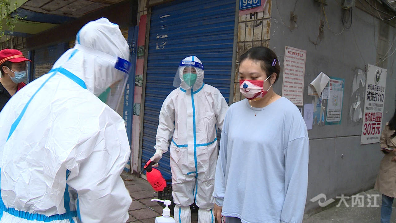 在内江经开区壕子口路社区,志愿者正在用小喇叭通知居民下楼进行核酸检测,居民们间隔1米有序排队,出示健康码后依次接受核酸检测。