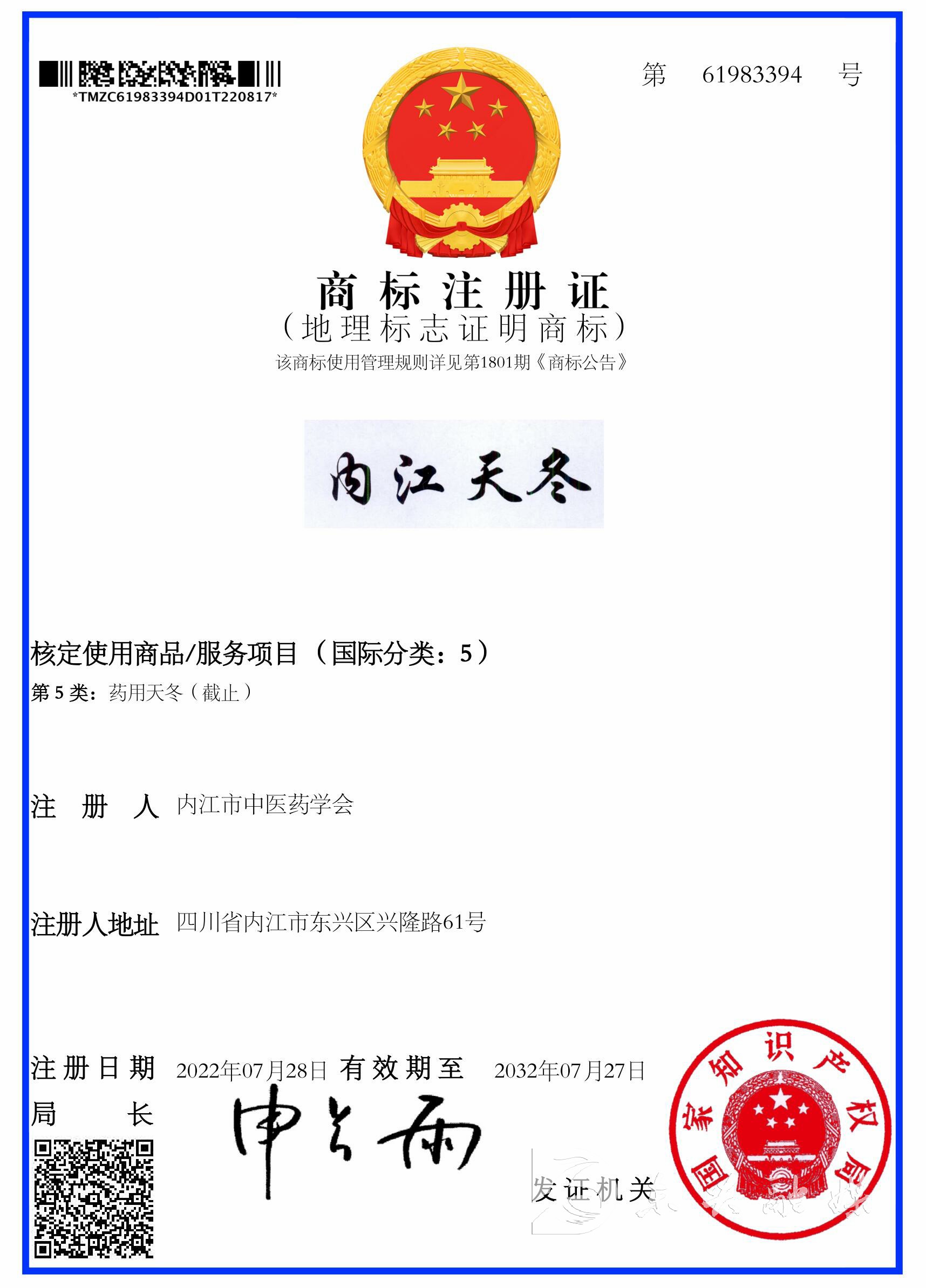 今年年初,内江市中医药学会向国家知识产权局提出注册“内江天冬”地理标志证明商标申请,申请类别为5类,近日,“内江天冬”商标成功注册,并刊登于国家知识产权局第1801期商标公告上。