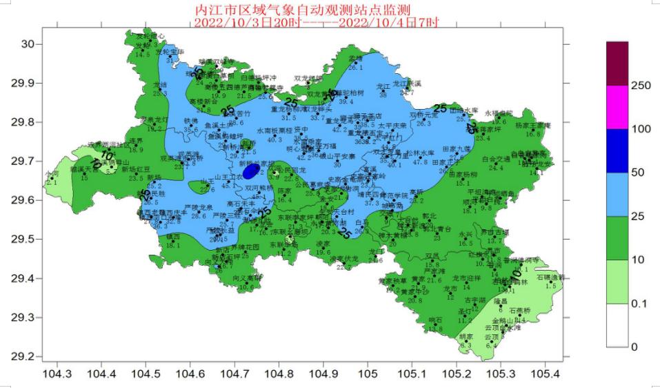 10月3日20时到4日07时,我市出现了一次雷阵雨天气过程,全市普降中雨到大雨,其中,资中县新桥兰家坝59.2毫米,东兴区富溪50.6毫米,达暴雨。全市148个观测站中,暴雨2站,大雨56站,中雨72站,小雨16站(具体雨量见附表)。最大小时降雨出现在东兴区富溪,4日2时雨量为34.5毫米。