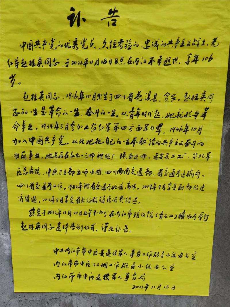 11月18日,红军后代联谊会内江分会发布讣告,公布了“内江红军后代联谊会名誉会长红军妈妈赵桂英”逝世的消息。