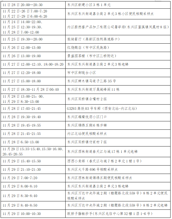 为方便市民排查风险轨迹,现将东兴区阳性感染者活动轨迹综合整理如下,请市民朋友们对照自查。如与以下活动轨迹有重叠,立即向村、社区和单位(或居住的酒店)报备,主动配合落实防控措施,如有瞒报将依法追究相关人员责任。