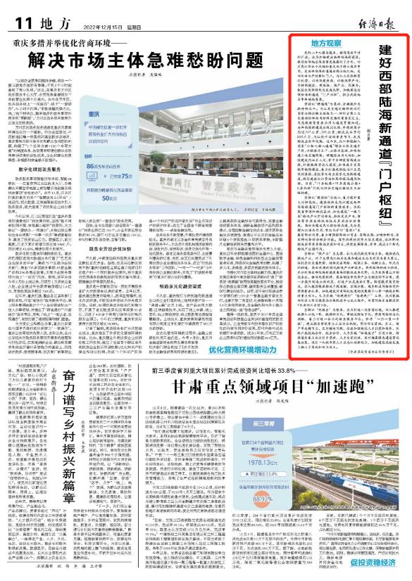 时间:2022-12-15 08:45:05 来源:经济日报今天(12月15日),市委书记邹自景在《经济日报》刊发题为《建好西部陆海新通道“门户枢纽”》的署名文章。