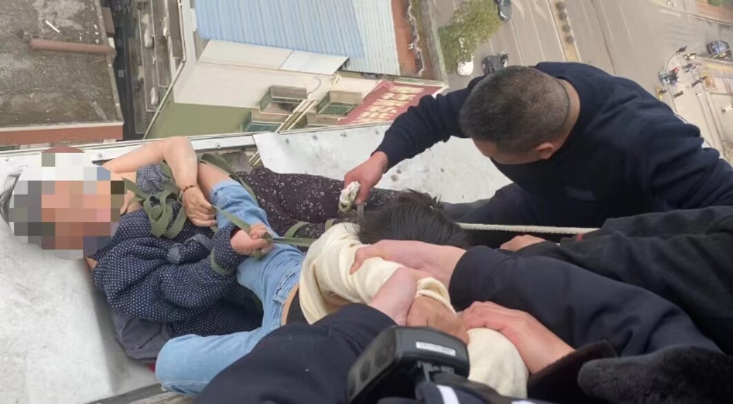 “我没有力气了,腿已经麻了”雨棚上的女子见到民警赶紧求助。民警陈孟立即翻出窗外将救援绳绑在女子身上,并在其他队员帮助下将女子拉进屋内。据了解,该女子是老人的孙女。老人掉出窗外后,她便翻出窗外拉住了老人。