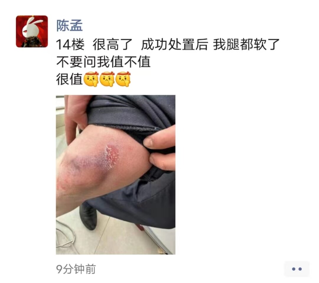 救援成功后,一直悬在窗外的陈孟在其他人帮助下回到了屋内才发现,腿上已经淤青且多处擦伤。事后,他发了一条朋友圈“14楼,很高了,成功处置后我腿都软了,不要问我值不值,很值”!