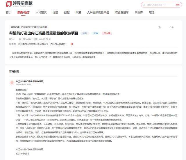 网友建言打造高品质重量级旅游项目!内江:正在进行