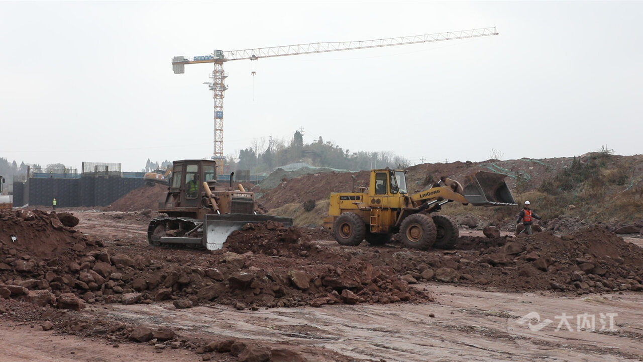 在内江软件与信息技术服务外包产业园(一期)项目现场,回填车、推土机、压路机在施工现场来回穿梭,工人们抢时间、抓进度、提效率,全力奏响工程建设“交响曲”。