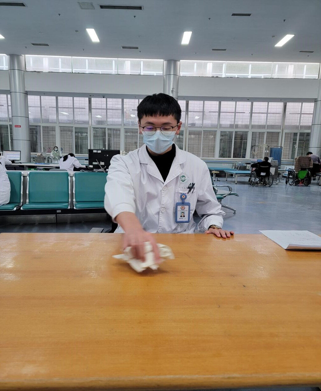 二、坐于桌前,手持“清洁布”,按照顺时针方向擦 10 圈,再按逆时针方向擦10 圈,该动作每日活动10分钟。