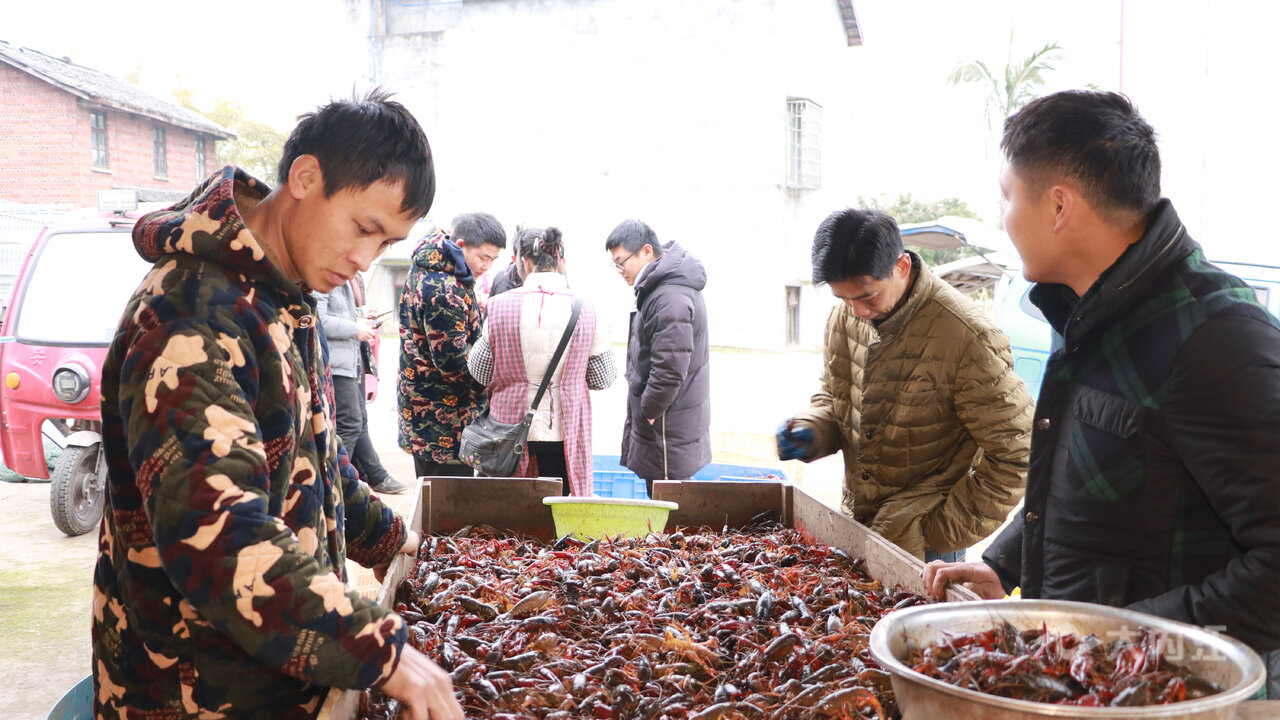 在联和村的小龙虾收购点,收购商周宾正与养殖散户们一起对小龙虾进行清理、分拣、称重,并及时打包发货。这次周宾收购了5、6百斤小龙虾,分拣好后将运送到重庆、成都、昆明等地售卖。