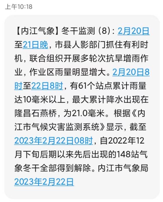 时间:2023-02-22 10:40:15 来源:内江市气象台好消息!刚刚,有不少市民收到内江市气象台发出的冬干监测信息,自2022年12月下旬后期以来先后出现的148站气象冬干全部得到解除。