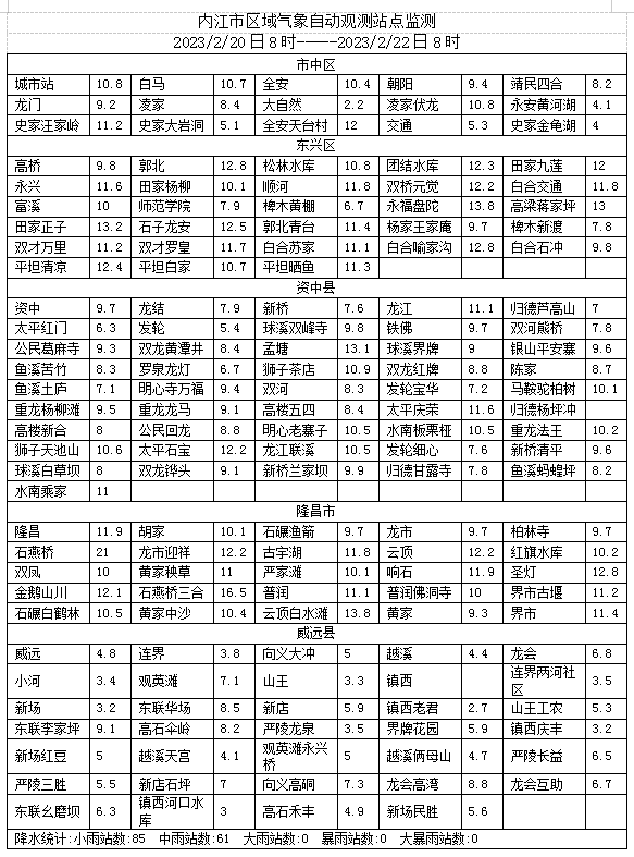 根据内江市气象台发布的雨情通报,2月20日08时至22日08时,内江市出现一次降温降雨天气过程,日平均气温下降5℃左右,西部普降小雨,东部普降中雨,累计雨量4~20毫米。全市148个观测站中10~25毫米61个,0~10毫米85个,最大降水出现在隆昌市石燕桥,累计雨量21毫米。(具体雨量见附表)