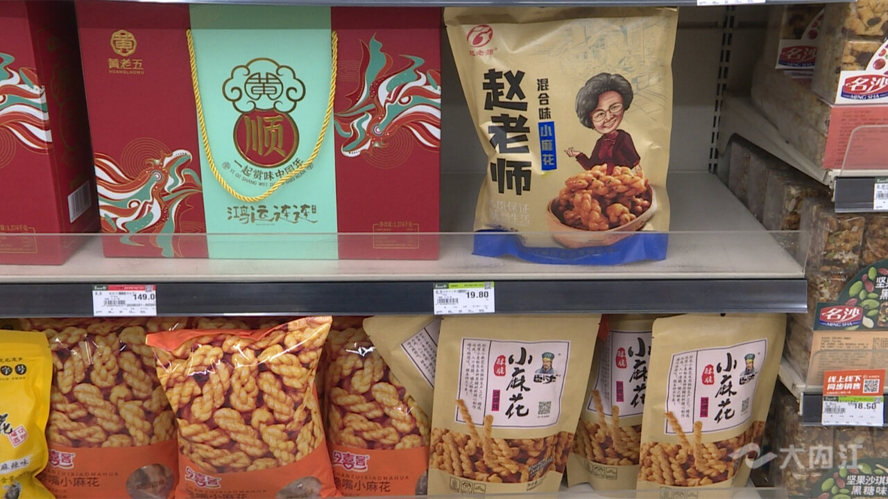 除了展销中心,在内江市各大超市的特产专区,内江甜食特产花生酥、蜜饯、麻饼等也被摆在了显眼的位置,方便市民选购。