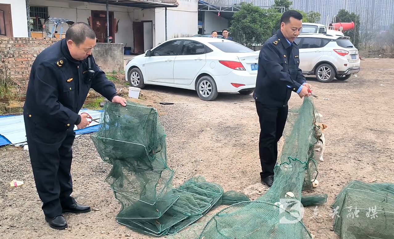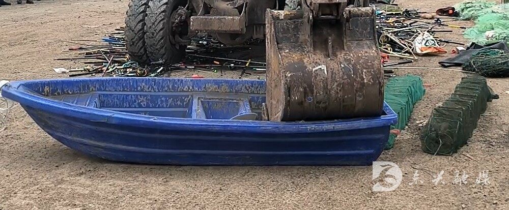 在非法渔具销毁现场,执法人员利用挖掘机、铁锤、剪刀对渔网、鱼竿等禁用渔具、非法钓具进行碾压、拆解,实现集中销毁。共计销毁鱼竿391根,网具36副,船舶1艘,电鱼工具4套等非法渔具钓具。同时,执法人员通过执法船只在沱江沿线向群众宣传普及禁渔范围、禁渔时间、禁渔要求等内容,提高群众的渔业法律法规意识。