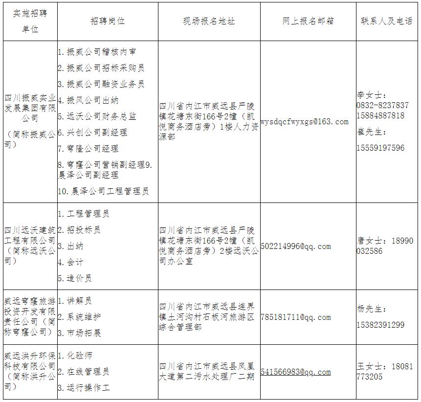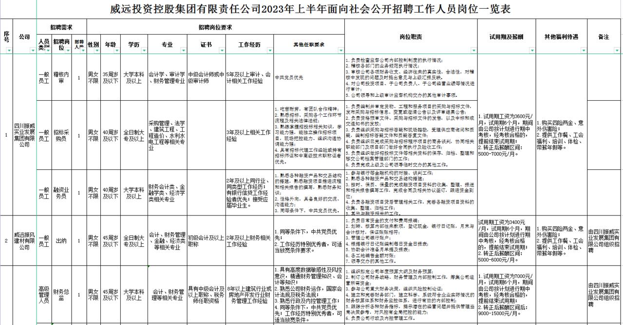 各岗位招聘要求、岗位职责等详见《威远投资控股集团有限责任公司2023年上半年面向社会公开招聘工作人员岗位一览表》(附件1)。