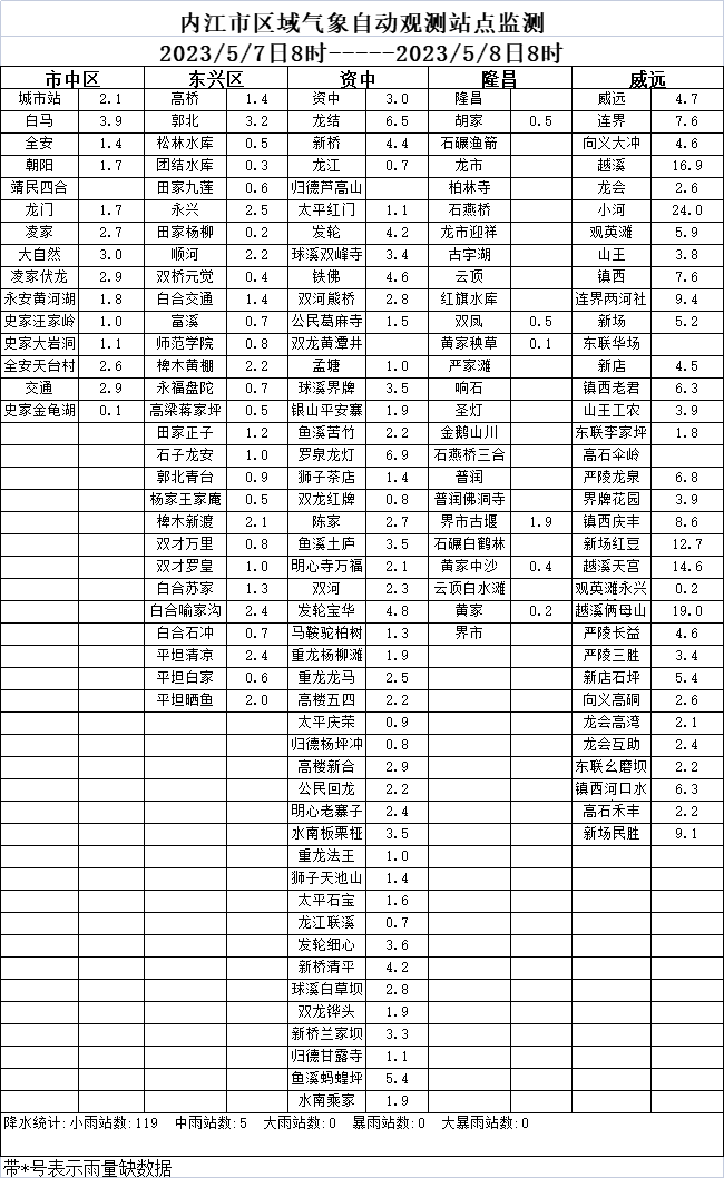 5月7日8时至8日8时,全市普降小雨,威远西部山区下了中雨,全市148个观测站中10-25毫米5个,0-10毫米119个。