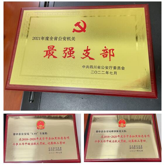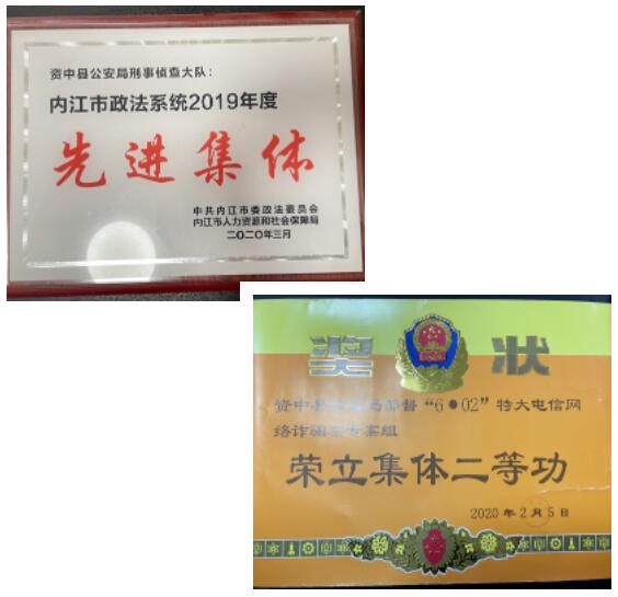 因工作成绩突出,资中县公安局刑事侦查大队先后荣获集体二等功4次,集体三等功2次;侦办的“5.09”特大电信诈骗案获公安部贺电;多次荣获先进党支部,优秀基层单位称号。