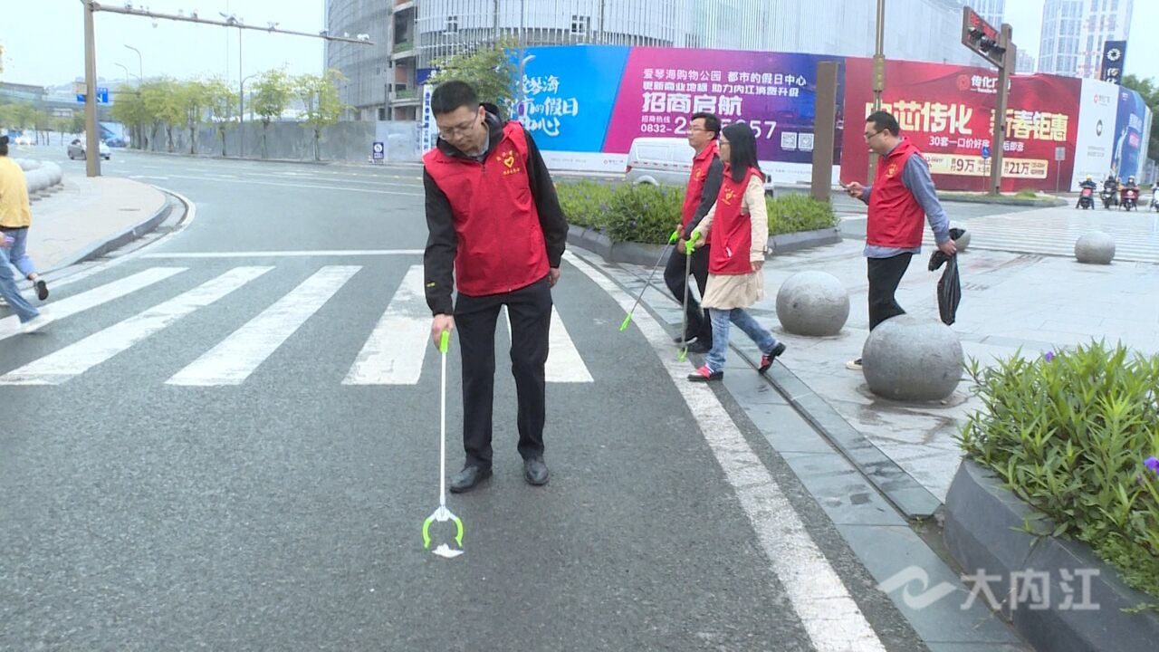 5月8日下午5点,记者在东兴区蟠龙路与汉安大道交汇口看到,来自市发改委的志愿者们身着红马甲、手提垃圾袋,清理人行道上的垃圾。