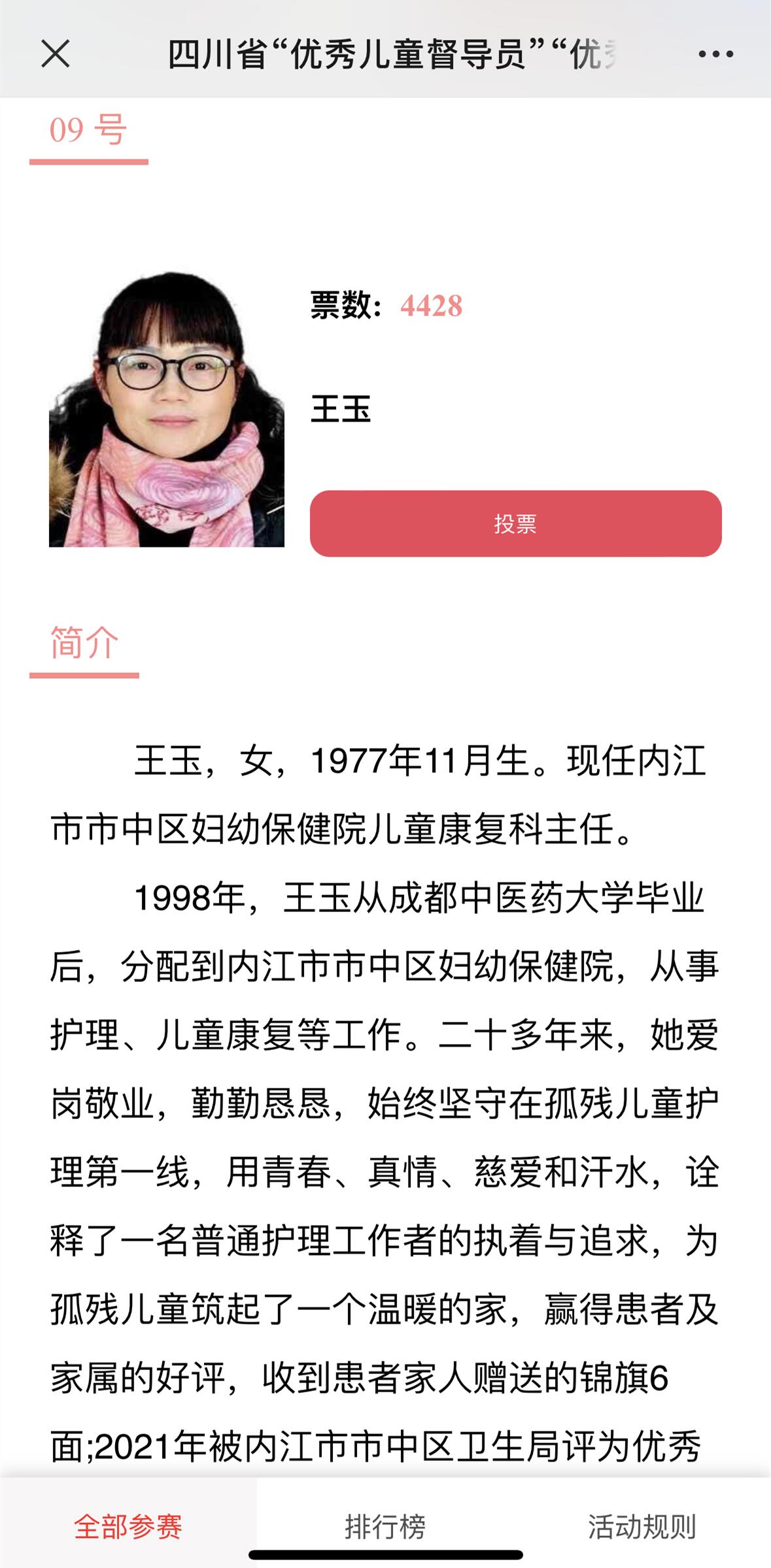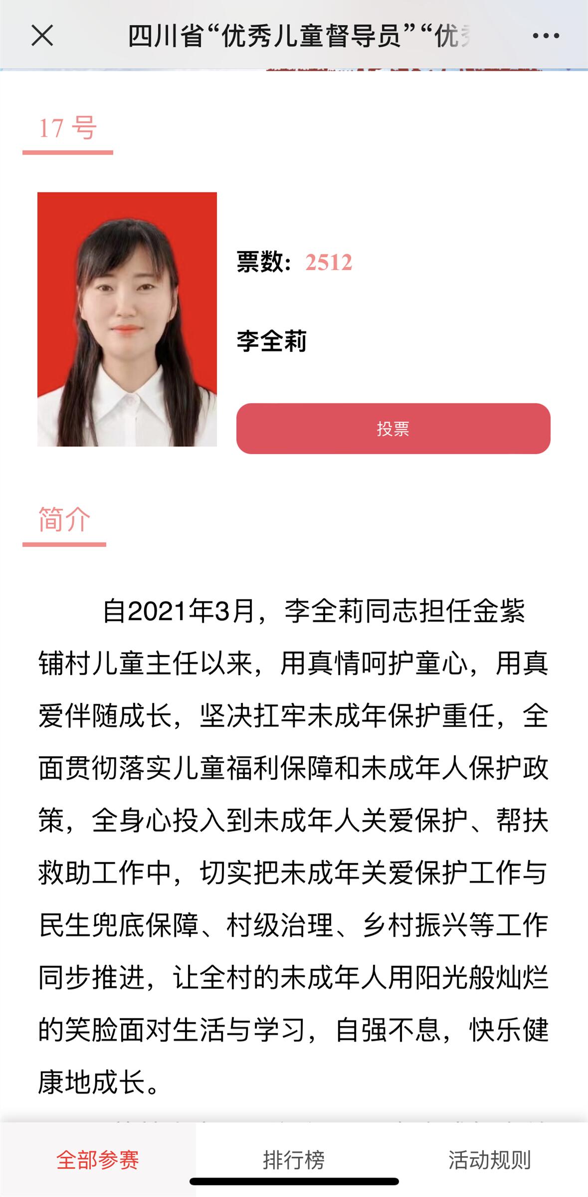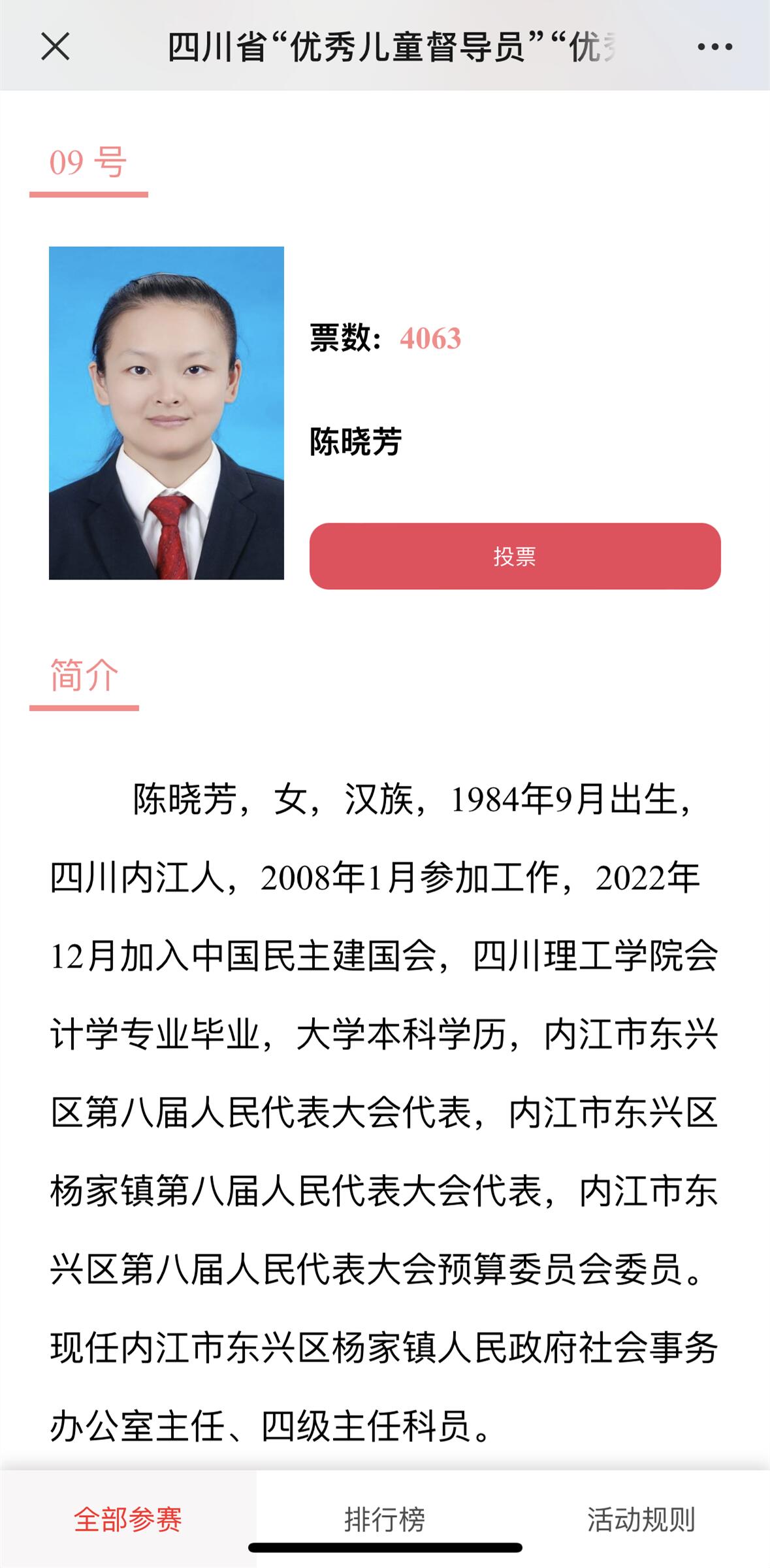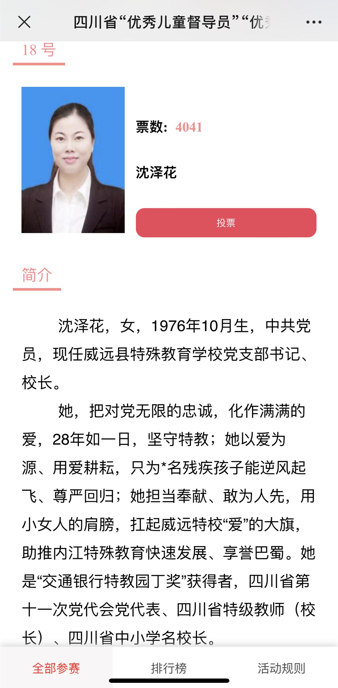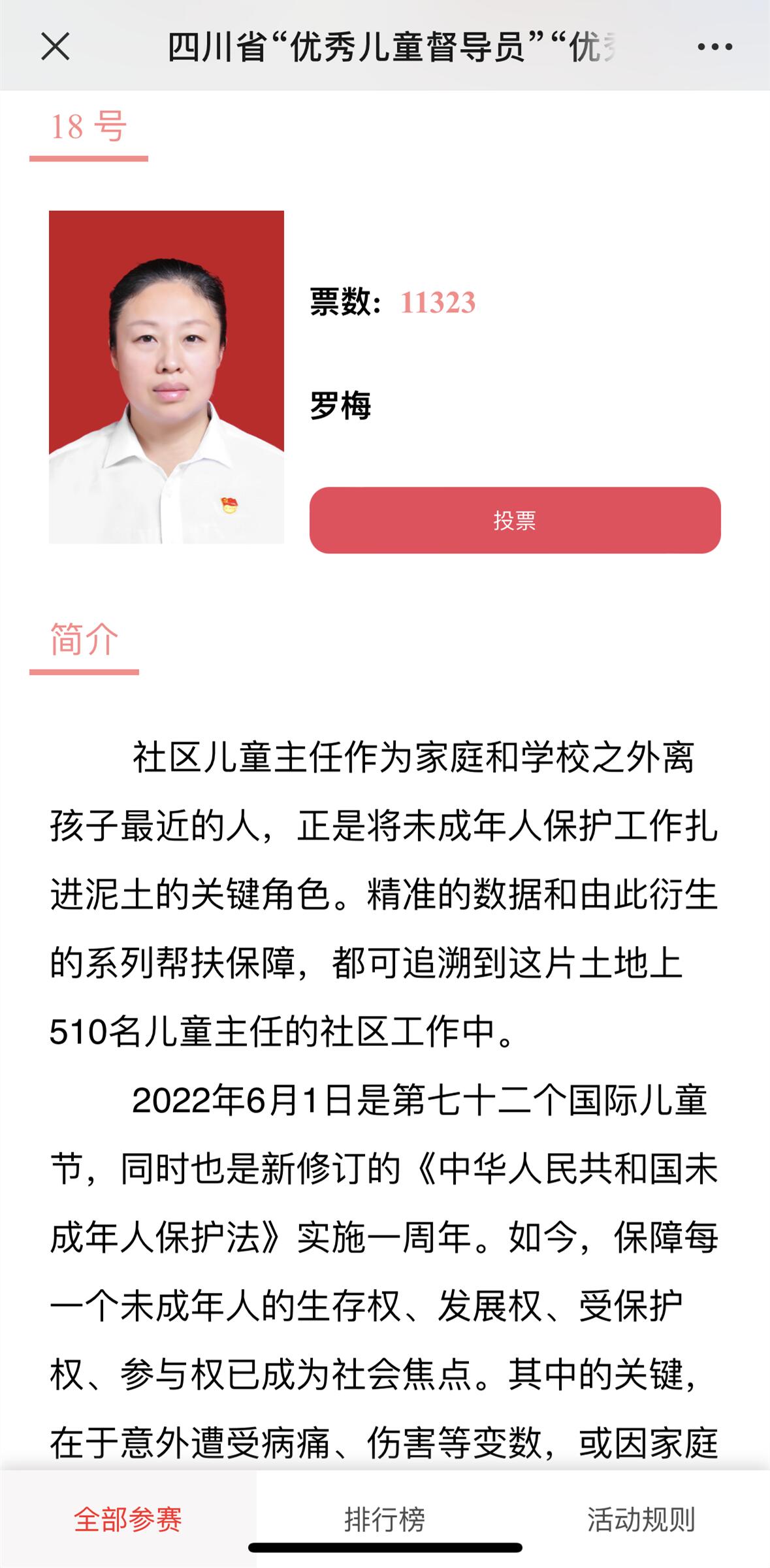投票规则:本次投票分为优秀儿童督导员、优秀儿童主任、优秀残疾儿童护理员、优秀未成年人护航者四个类别,每人每天每个类别限投5票。