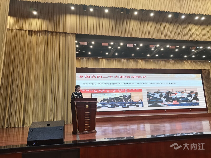 宣讲中,内江市公安局刑警支队技术大队副大队长王艳、凉山监狱刑罚执行监督专员郑莲丽分别以《新时代开启新征程,新使命谱写新篇章》《法治相伴行,藏蓝谱新篇》为题作了深入浅出的宣讲,引导广大公安民警、干部职工深入学习贯彻党的二十大精神,深刻领悟“两个确立”的决定性意义,增强“四个意识”、坚定“四个自信”、做到“两个维护”,推动全社会形成尊法、学法、守法、用法的浓厚氛围。