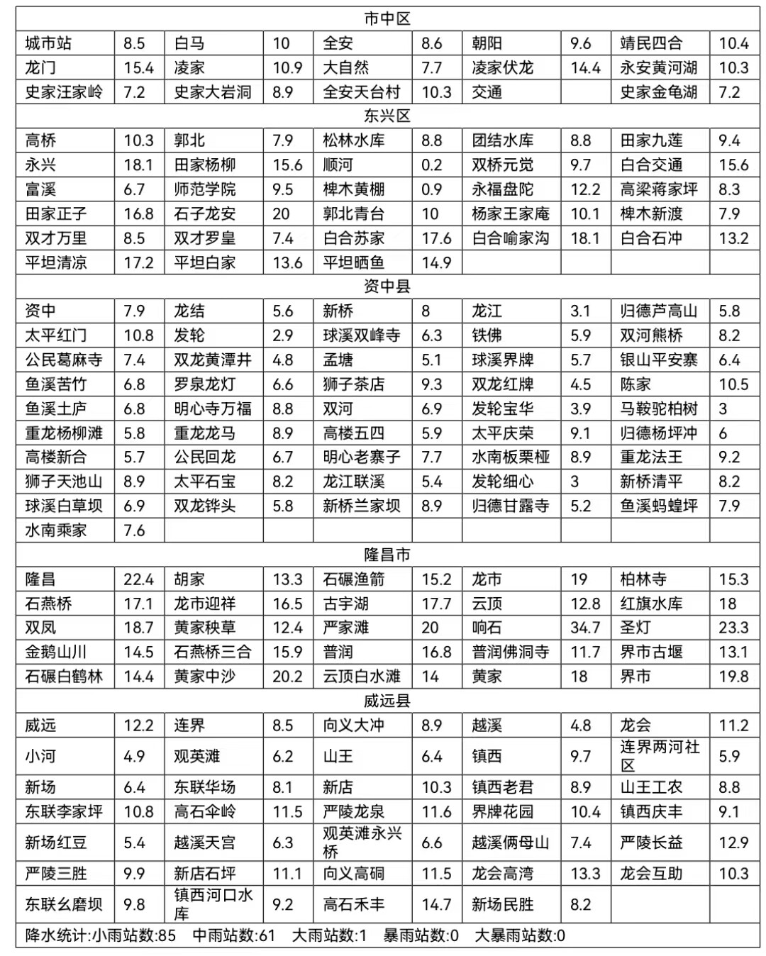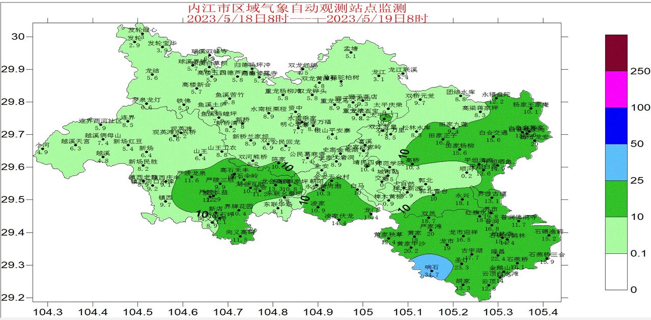 5月18日8时至19日8时,我市普降小雨到中雨,隆昌市个别站点下了大雨。全市148个观测站中25-50毫米1个,10-25毫米61个,0-10毫米85个,最大雨量出现在隆昌响石,达34.7毫米。(具体雨量见附表)