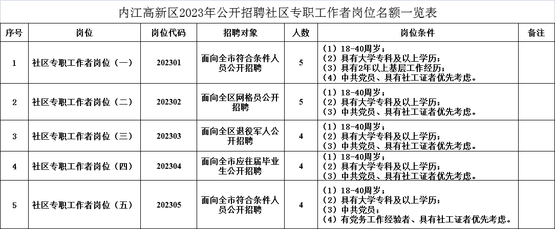 本次共选聘社区专职工作者22名,具体招聘岗位、名额及报考资格条件详见《内江高新区2023年公开招聘社区专职工作者岗位名额一览表》。本次招聘的社区专职工作者不纳入机构编制管理范围。