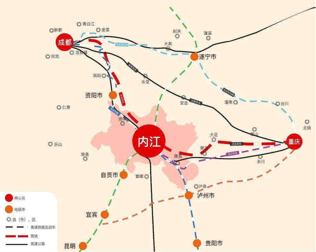 “心”就是成渝之心。内江位于成都、重庆两个特大城市中间,是国家区域性综合交通枢纽,县县通高速,今年将实现县县通高铁。