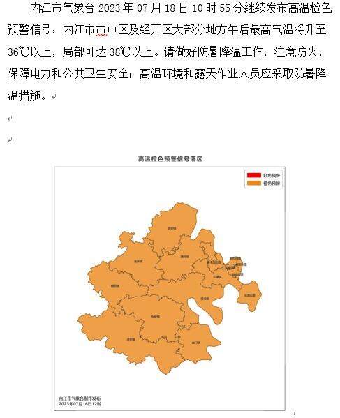 7月18日上午,内江多地接连发布高温橙色预警信号,详情如下:
