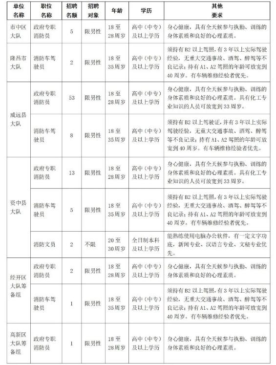 为进一步加强全市消防救援力量建设,按照公开、平等、竞争、择优的原则,内江市消防救援支队面向社会公开招聘90名政府专职消防队员和2名消防文员。现将有关事项公告如下: