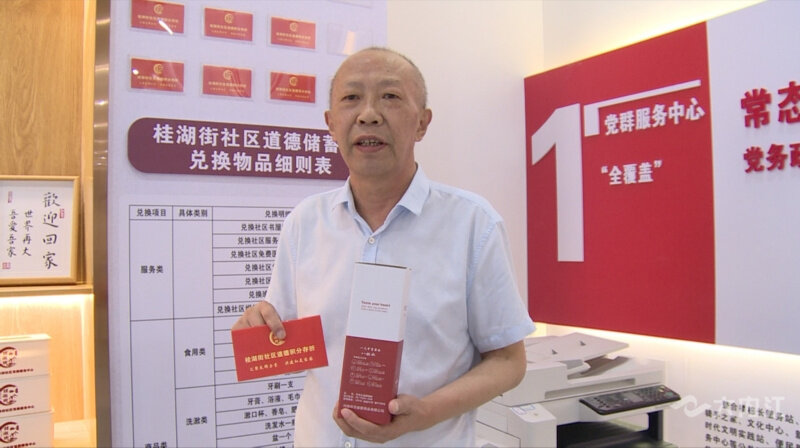 在桂湖街社区,居民罗先有正拿着自己的“桂湖街社区道德积分存折”来到桂湖街社区新时代文明实践站,准备在兑换区用自己的积分换一些日常用品。