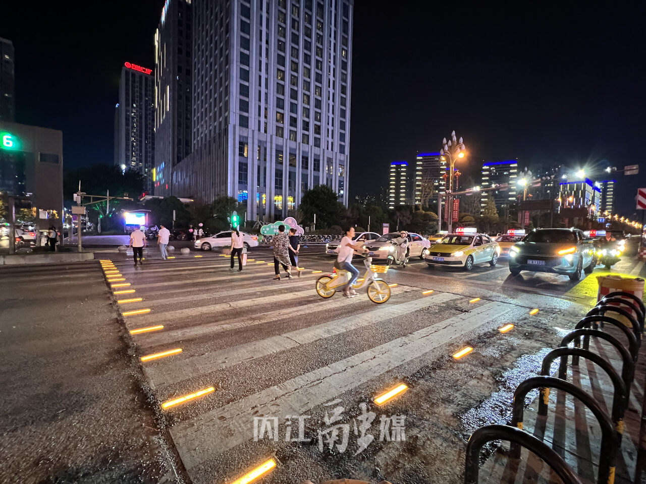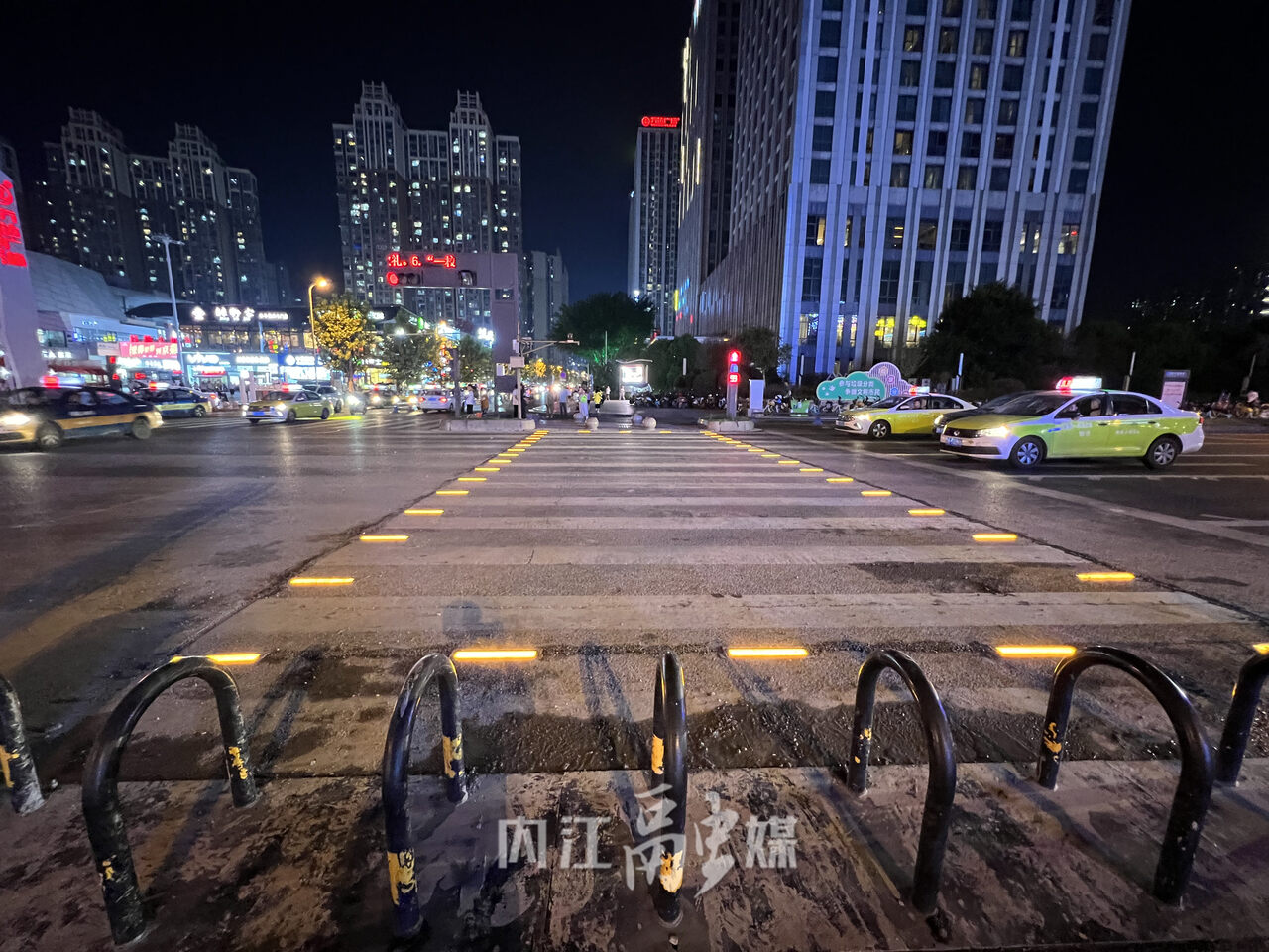 内江交警直属二大队民警陈林:“这个路口位于万达商圈周边,车流量人流量都非常大,通过事故预防研判,该路口虽然安装有交通信号灯,但夜间在照明不足的情况下,依然存在一定的安全隐患,这种情况下,我们交警部门在该路口斑马线车辆停止线一侧安装了地埋式预警灯,保障行人过街安全。”