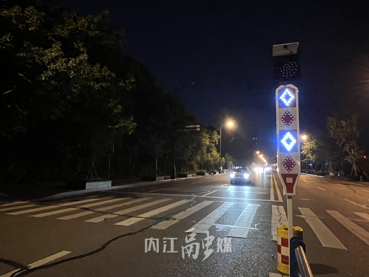 除此之外,为了提高夜间行车的警示作用,交警部门还在兰桂大道内江二水厂附近的两条斑马线处新增设了闪光立柱,以提醒过往车辆注意礼让行人、达到提前减速的效果。