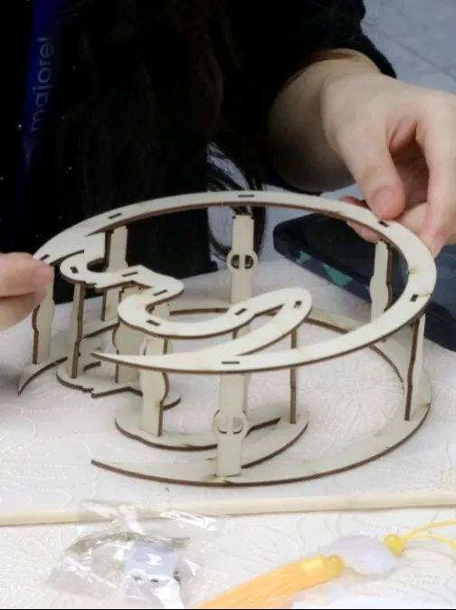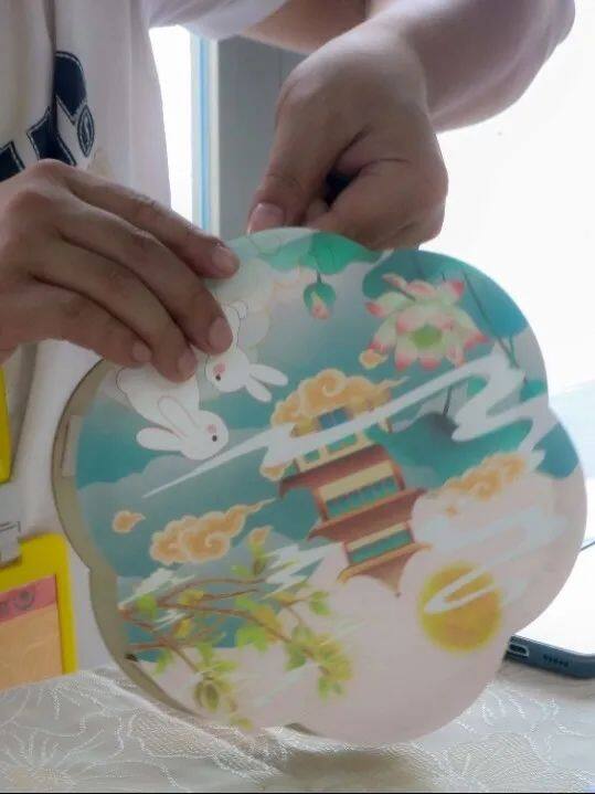 中秋节点花灯是一种传统文化活动,花灯象征着团圆和美好的愿望,也寓意着人们对美好生活的向往和追求。接下来便是本次活动的第二个环节——巧做花灯!工作人员带领大家先对骨架进行基础的拼接,再将LED灯在骨架上进行缠绕固定,最后把裁剪完的图案依次粘贴在骨架上,最后一个漂亮的古风“玉兔灯笼”就大功告成啦!