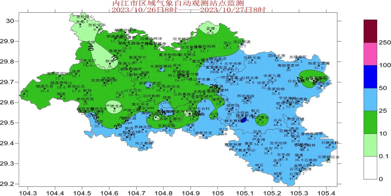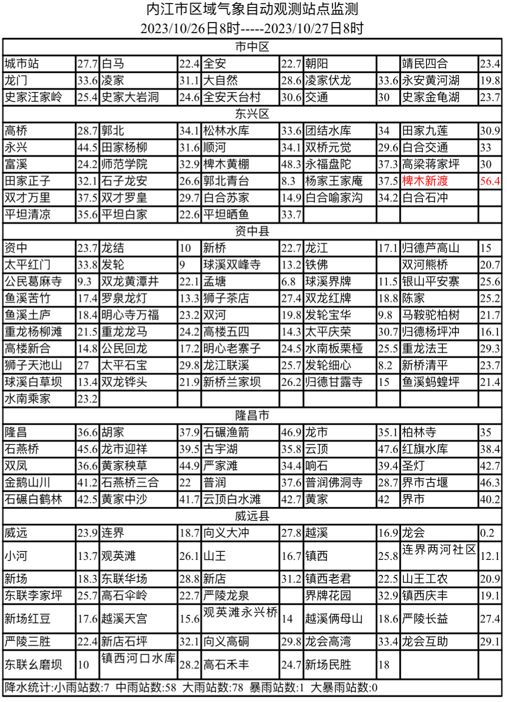 10月26日08时至27日08时,我市西部普降中雨,东部普降大雨,全市148个观测站中50-100毫米1个,25-50毫米78个,10-25毫米58个,0-10毫米7个。最大降雨出现在东兴区椑木新渡,雨量为56.4毫米(具体雨量见附表)。