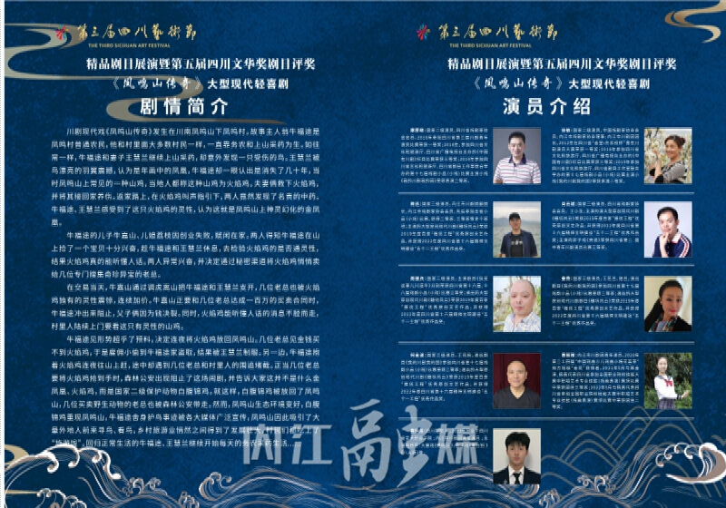 据了解,大型现代川剧《凤鸣山传奇》故事发生在川南凤鸣山下的凤鸣村,以“飞凤”“救凤”“试凤”“购凤”“盗凤”“放凤”为发展线,通过一段现代乡村传奇、一个啼笑皆非的喜剧故事,展现了“绿水青山就是金山银山”的理念对农村生态环境保护、乡村振兴和文旅融合发展的重大意义,歌颂了守护青山绿水、守护美好家园的平凡英雄。