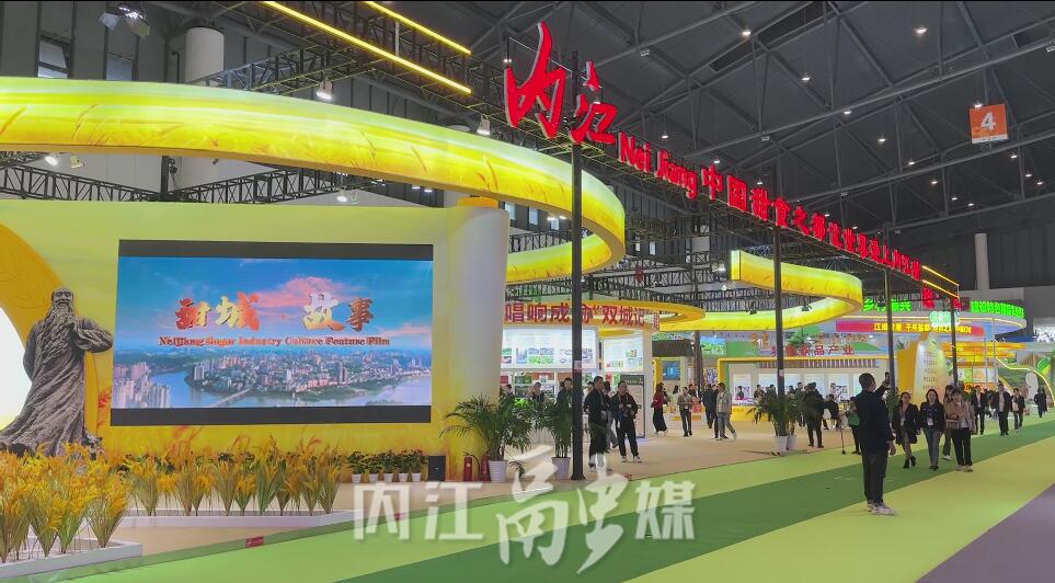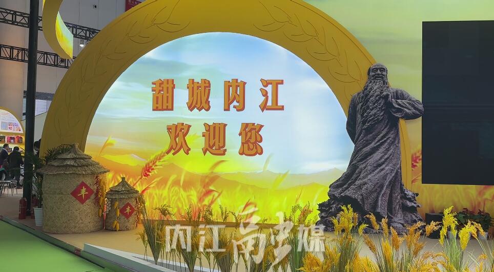 金黄的稻穗装点、张大千雕像挺立、循环播放的内江城市形象宣传片……进入内江馆,“甜城内江欢迎您”的字样迎接着八方来客。