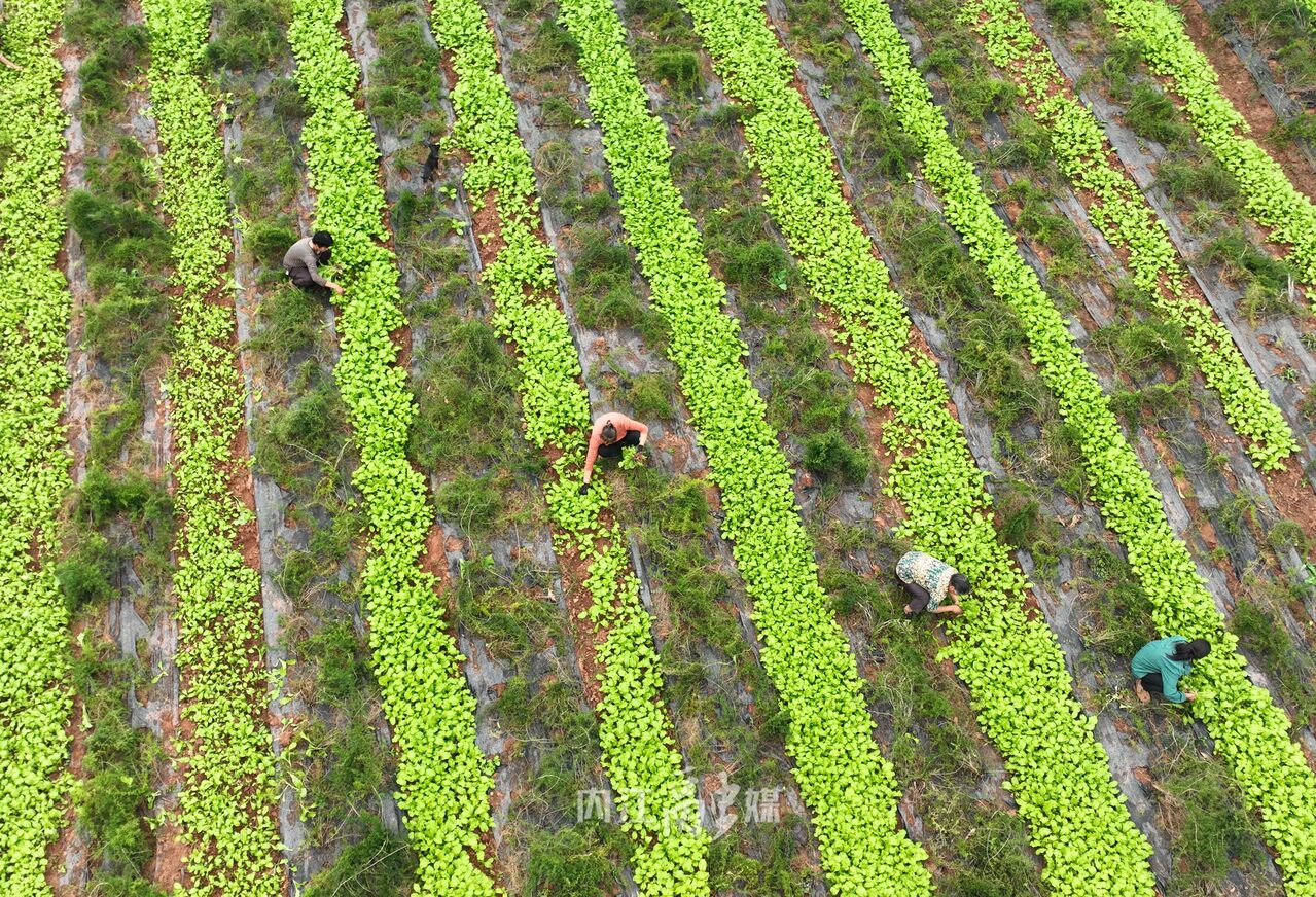 与火热的播种场面不同,在花祠村的另一处山坳里,已经栽种下1年多的天冬长势良好,放眼望去,一垄一垄如绿浪般向远方延伸。村民们小心翼翼地除草,精心护理着天冬之间才栽种下不久的榨菜。