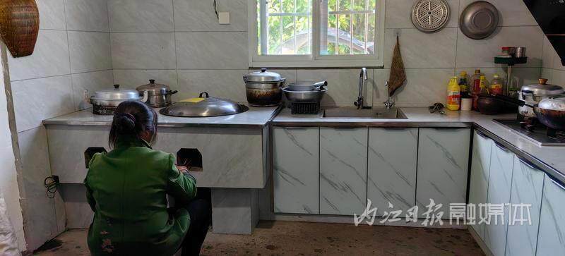 陈春花家使用了20多年的老旧柴灶如今改造成了柴火与燃气两用,灶台贴上了瓷砖,安装了抽油烟机,崭新的橱柜将餐具收纳整齐,颇具现代风格的厨房与这栋二层小楼更显贴切。