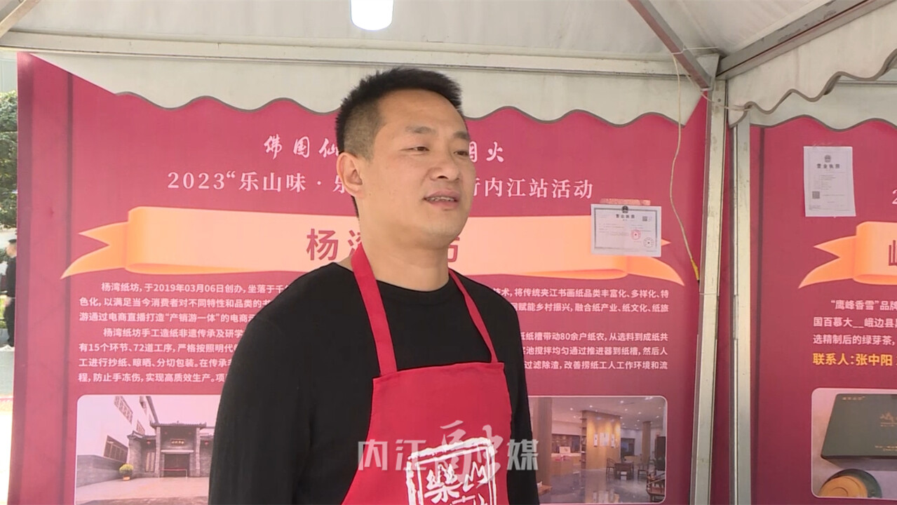 夹江县杨湾手工竹纸有限公司周波说:“这一次夹江的书画纸来到张大千的家乡,既是文化的一脉相承,也是文化的融合相通,很高兴来到内江参加2023乐山味乐山造全国行内江活动,确实感觉到内江人民很有书法底蕴。”