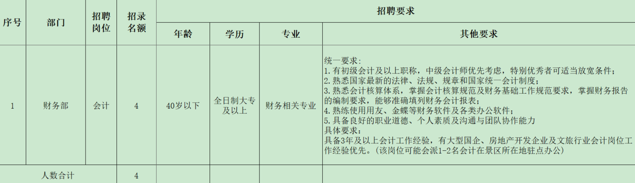 本次公开招聘财务部会计岗4名,岗位招聘要求详见《内江汉安农村基础设施建设有限公司招聘岗位计划表》(附件1)。